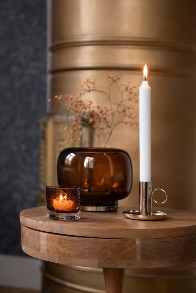 Tunnelmallinen lasilyhty – pieni yksityiskohta, suuri vaikutus. Elegantti sylinterimäinen muoto ja kauniisti ”vasaroitu” lasipinta luovat upean valon leikin, joka tuo tilaan rauhallista tunnelmaa. Sopii erinomaisesti lämpökynntilöille ja pienille LED-kynttilöille. Koko 6,5 x 6,5 x 6,5 cm.