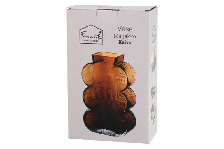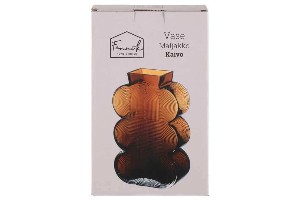 Fanni K:n maljakko Kaivo on ruskeaa läpivärjättyä, mutta läpikuultavaa lasia. Lasipinnassa kuviointi. Tuote on käsintehty, joten tuotekohtaisia eroja saattaa esiintyä. Käsinpesu.