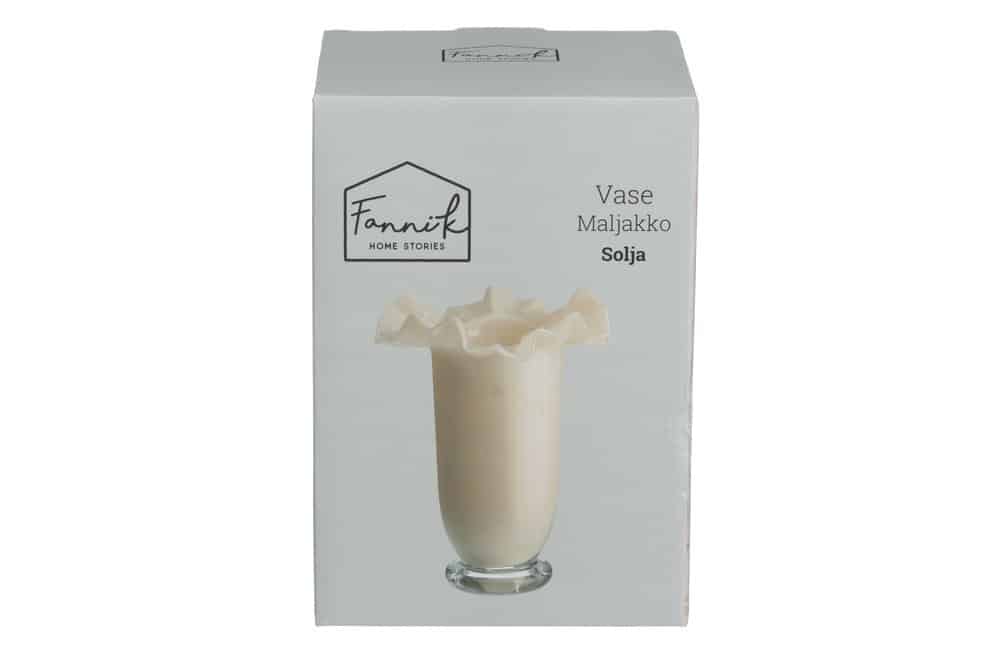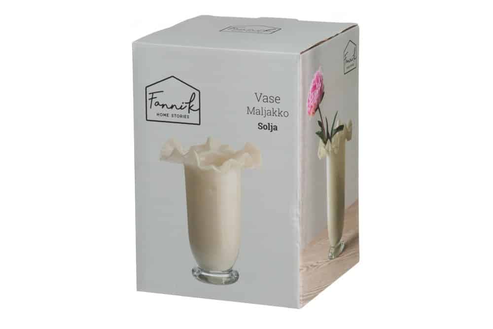 Fanni K:n Solja-maljakko on kuin kukka, sen aaltoileva yläreuna tuo mieleen herkät terälehdet, jotka avautuvat kohti valoa. Jokainen maljakko on käsintehty ja valmistettu läpivärjätystä lasista. Pienet yksilölliset erot kuuluvat tuotteen luonteeseen. Käsinpesu.