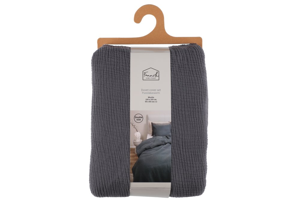Pussilakanasetti on valmistettu pehmeästä ja ilmavasta kolminkertaisesta musliinipuuvillasta, joka tuntuu miellyttävältä ja viileältä ihoa vasten. Pussilakanan alareunassa on napit, jotka helpottavat käyttöä ja pitävät peiton paikoillaan. Koko pussilakana 220 x 210 cm, tyynyliinat 50 x 60 cm. Materiaali 100 % puuvilla. Tuotteella on Ökotex-sertifikaatti, mikä tarkoittaa että tuote on turvallinen eikä se sisällä haitallisia kemikaaleja.